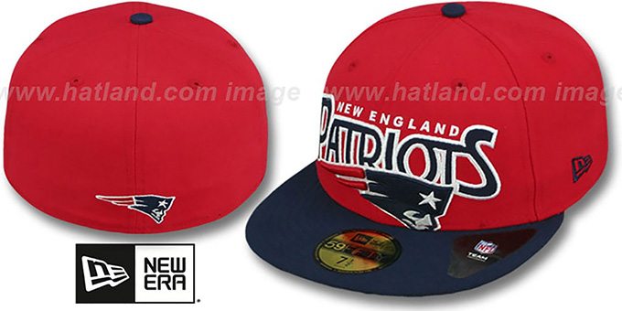 Authentic and ORIGINAL 59Fifty fitted on-field high tech poly fabric hat by New Era, red deep crown and navy blue visor, light grey undervisor, raised embroidered team name over team logo on front, embroidered team logo on rear of hat. This New England Patriots hat is made by New Era and is licensed by the NFL National Football League.
