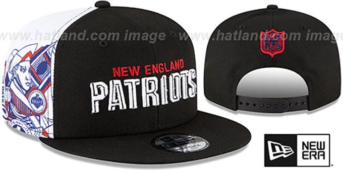 Original fit 9FIFTY authentic poly hat by New Era that has similar deep crown and flat brim fit as the 59-Fifty, black crown and visor, black undervisor, team card print on white side panel in team colors, raised embroidered team name on front, embroidered New Era flag on side, NFL shield logo on back in team colors above black adjustable Snapback strap closure. This New England Patriots hat is made by New Era and is licensed by the NFL - National Football League.