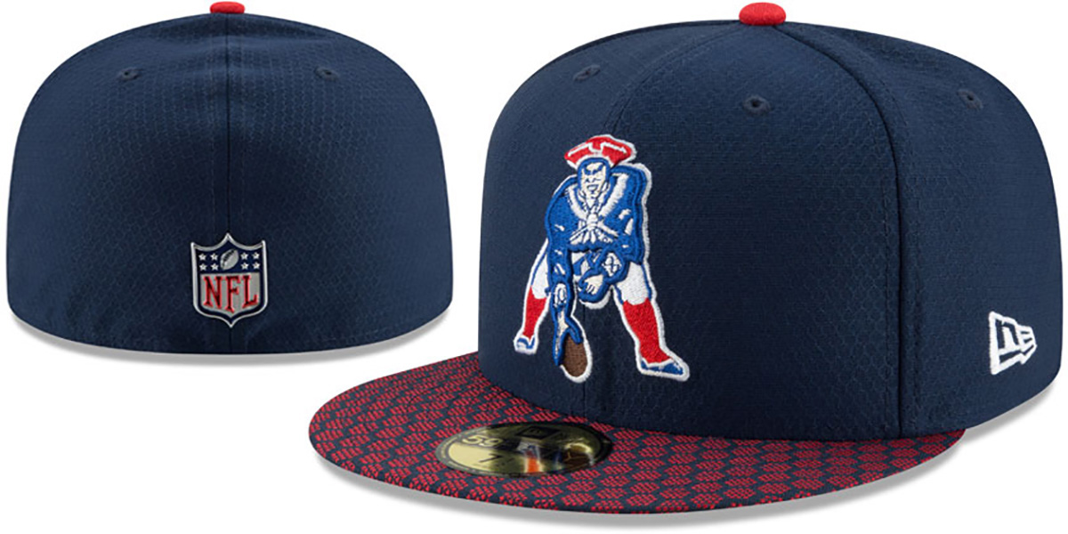 Authentic and ORIGINAL 59Fifty fitted hat by New Era, navy blue performance poly deep crown with tiny tonal honeycomb texture, navy visor with red perforated honeycomb print, navy undervisor, raised embroidered Throwback team logo on front, embroidered New Era flag on side, liquid chrome NFL shield logo on back. This New England Patriots hat is made by New Era and is licensed by the NFL - National Football League.