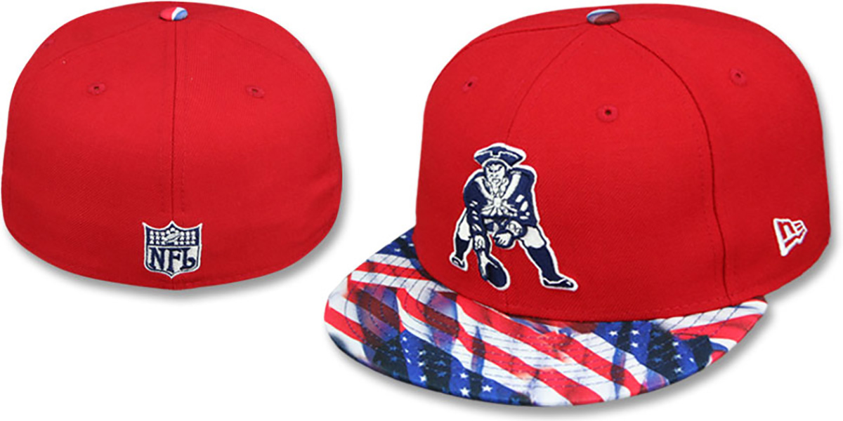 Authentic and ORIGINAL 59FIFTY fitted hat by New Era, red wool deep crown, New Era Exclusive Hi-Res red, white and blue USA Waiving Flag print visor and button(each print will be slightly different and unique), navy blue undervisor, raised embroidered team logo on front in navy and white, matching raised embroidered NFL Shield logo on back. This item is on SALE!. This New England Patriots baseball cap is made by New Era and is licensed by the NFL - National Football League.