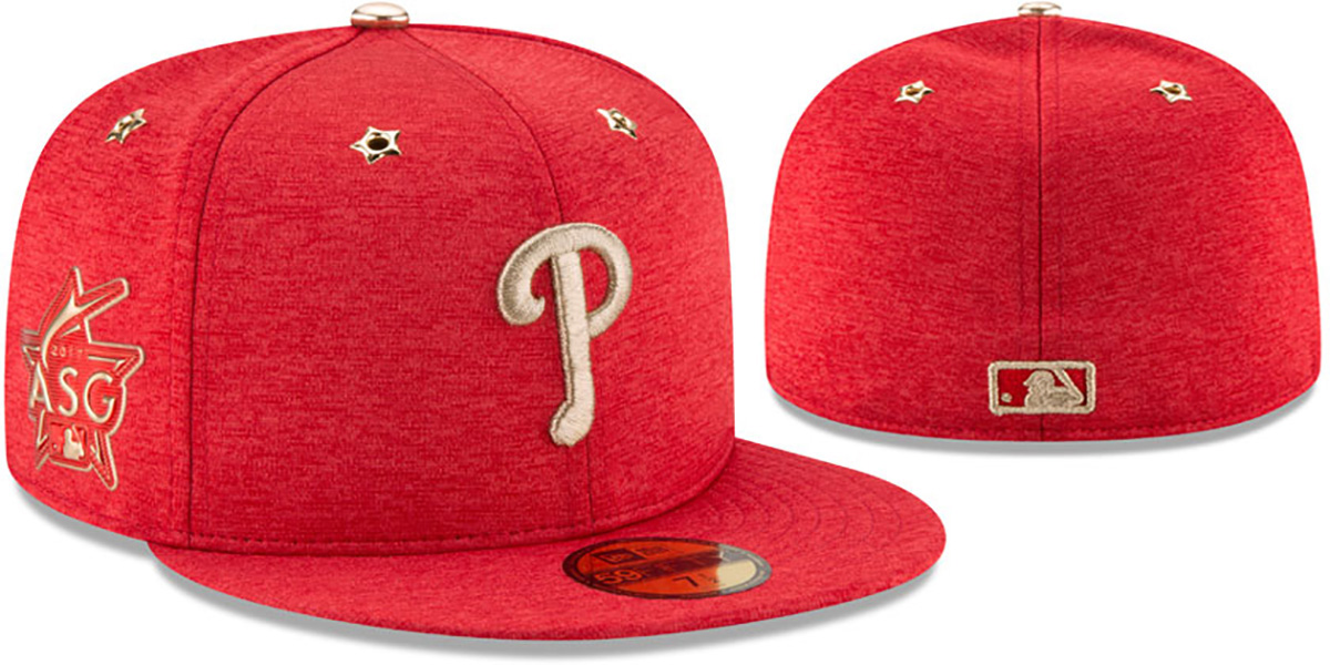 LIMITED QUANTITIES, Orders now shipping!!, Authentic and ORIGINAL 59FIFTY fitted onfield poly hat by New Era, red heather tech deep crown and visor, red undervisor, raised embroidered team logo on front in metallic gold, gold star rivets on each eyelet, matching 2017 All-Star logo patch on side, matching embroidered New Era logo on opposite side, matching raised embroidered MLB logo on back, This is the hat worn during 2017 All-Star Game in Miami FL. This Philadelphia Phillies baseball cap is made by New Era and is licensed by the MLB - Major League Baseball.