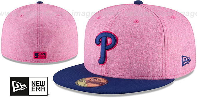 Authentic and ORIGINAL 59FIFTY poly fitted hat by New Era, shadow tech heather pink deep crown and royal blue visor, matching raised embroidered team logo on front, royal embroidered New Era logo on side, matching raised embroidered MLB logo on back , The hat worn by all MLB teams on Mother's Day 2018. This Philadelphia Phillies baseball cap is made by New Era and is licensed by the MLB - Major League Baseball.