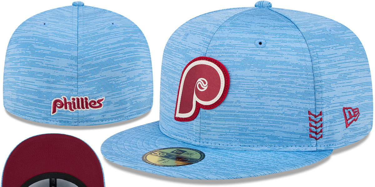 Authentic and ORIGINAL 59FIFTY fitted hat by New Era, heathered sky (light) blue performance poly/spandex crown and visor, baseball stitching on front side seams in team color, burgundy undervisor, raised embroidered and stitched 2024 Clubhouse Cooperstown team logo on front in team colors, embroidered New Era flag on side, embroidered secondary team logo on back in team colors. This Philadelphia Phillies baseball cap is made by New Era and is licensed by the MLB - Major League Baseball.