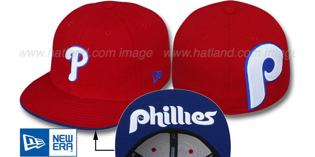 Authentic and ORIGINAL 5950 fitted hat by New Era, red wool crown and and visor, royal blue undervisor and flip with embroidered Team Font, raised embroidered team logo on front, Oversized and Extra raised embroidered Cooperstown team logo on side back . This Philadelphia Phillies hat is made by New Era and is licensed by the MLB - Major League Baseball.
