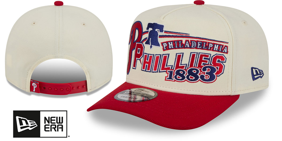 Adjustable A-FRAME five panel hat by New Era with pinched seam on front panels, chrome (cream) authentic poly crown and red visor with throwback dark kelly green undervisor, team classic logo flat embroidery on front across front panels, embroidered New Era logo on side, matching adjustable Snapback closure with team hangtag. This Philadelphia Phillies hat is made by New Era and is licensed by the MLB - Major League Baseball.