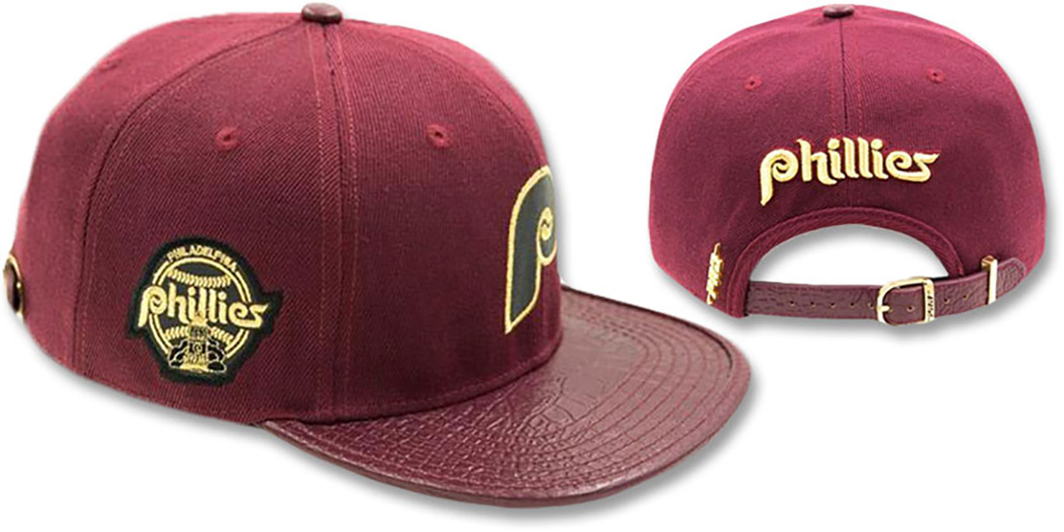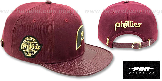 Authentic wool blend adjustable hat by Pro Standard with original cut and flat brim, burgundy crown with burgundy pebbled 100% premium leather visor, burgundy undervisor, raised embroidered gold metallic outline around black team 3M Cooperstown team logo on front, matching alternate team logo on side, raised embroidered team font on back, gold metal PRO logo on back, matching premium leather strap and metal buckle closure. This Philadelphia Phillies hat is made by Pro Standard and is licensed by the MLB - Major League Baseball.