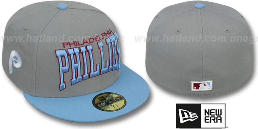 Authentic and ORIGINAL 59FIFTY 100% performance high tech polyester fitted hat by New Era, grey deep crown with sky (light) blue visor, throwback kelly green undervisor, embroidered city name over raised embroidered Pro-Arch team name on front, embroidered team logo on side, raised embroidered MLB logo on back. This Philadelphia Phillies baseball cap is made by New Era and is licensed by the MLB - Major League Baseball.