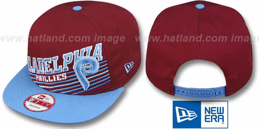 Original fit 9FIFTY adjustable cotton twill hat by New Era that has similar deep crown and flat brim fit as the 59-Fifty, burgundy crown with sky (light) blue visor and throwback kelly green undervisor, embroidered Angled team color stripes on front panels with embroidered city and team name and Cooperstown, Old School logo, embroidered team logo on side, New Era logo on opposite side, secondary team color plastic adjustable Snapback strap. This item is on SALE!. This Philadelphia Phillies hat is made by New Era and is licensed by the MLB - Major League Baseball.