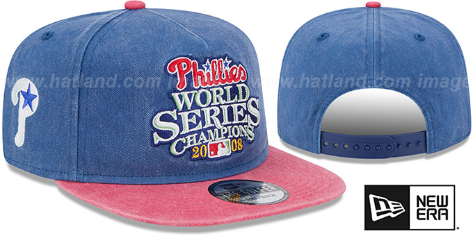 Golfer fit A-FRAME five panel adjustable hat by New Era, prewashed royal blue cotton twill crown and red visor with throwback dark green undervisor, flat embroidered 2008 WORLD SERIES CHAMPIONS logo on front, embroidered New Era logo on side, flat embroidered team logo on opposite side, matching adjustable Snapback closure. This Philadelphia Phillies hat is made by New Era and is licensed by the MLB - Major League Baseball.