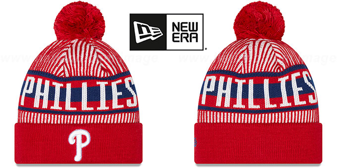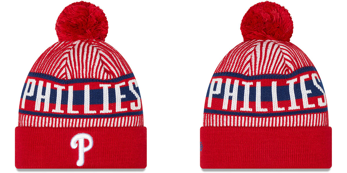 Red, royal blue, and white acrylic ribbed knit crown with team nickname in white on front and back of crown, embroidered team logo on front of cuff, matching team color pom-pom on top, embroidered New Era Flag on side. This Philadelphia Phillies hat is made by New Era and is licensed by the MLB - Major League Baseball.