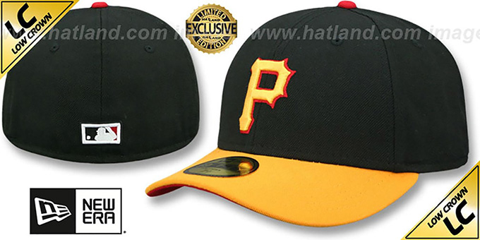 Authentic and Low-Profile 59FIFTY fitted hat by New Era, black authentic poly low profile rounded crown and slightly curved gold visor, red undervisor, raised embroidered 2001 Cooperstown, Old School team logo on front, embroidered New Era flag on side, embroidered Cooperstown, Old School MLB logo on back. This Pittsburgh Pirates baseball cap is made by New Era and is licensed by the MLB - Major League Baseball.