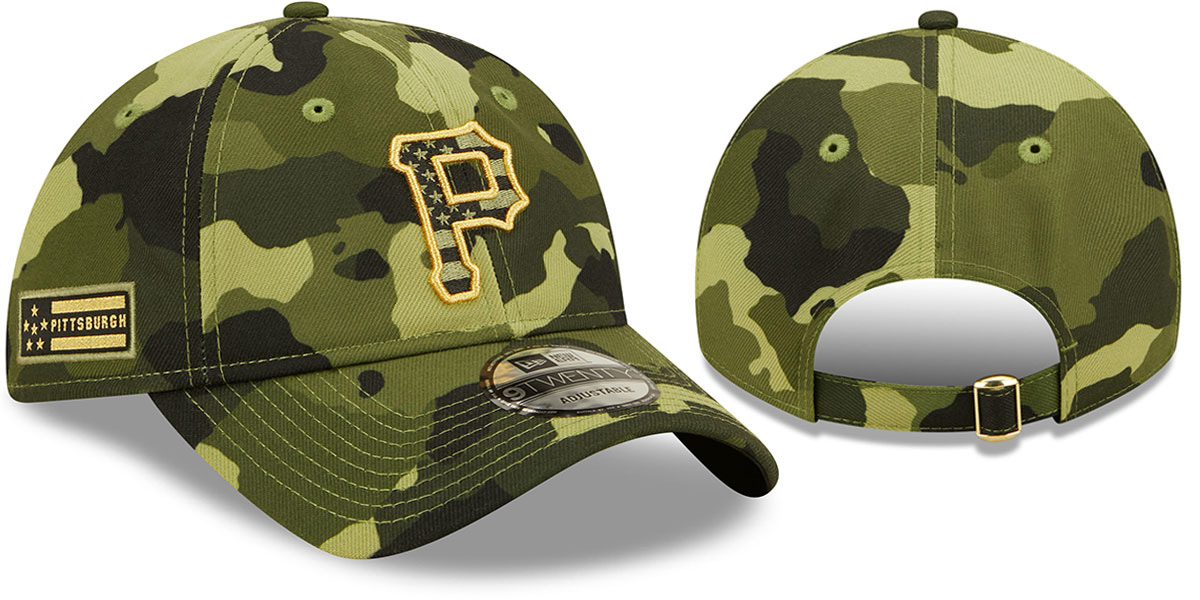 Low Profile and lightly structured 9TWENTY slouch hat by New Era, green camo authentic poly crown and pre-curved visor with black undervisor, raised embroidered 2022 Armed Forces Day team logo on front in metallic gold with black and olive USA flag fill, embroidered 6 star patch on side with city in metallic gold and black, New Era logo on opposite side in metallic gold, matching adjustable strap with slide loop closure. These commemorative caps honor our Armed Forces through patriotic themes that remind us all of the dedication of our troops. A portion of proceeds from the sale of 'Stars & Stripes' caps support the Welcome Back Veterans Fund, an organization that provides support to veterans and their families when they come home from war. EACH CAMO HAT PATTERN WILL BE SLIGHTLY DIFFERENT SO NO TWO HATS WILL BE THE SAME. This Pittsburgh Pirates hat is made by New Era and is licensed by the MLB - Major League Baseball.