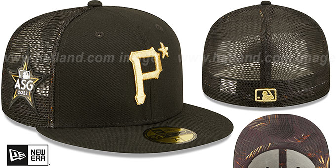 Authentic and ORIGINAL 59FIFTY fitted hat by New Era, black authentic poly front panels and visor with black trucker mesh middle and back panels, orange gold and grey palm print on undervisor-sweatband-inside seams, raised embroidered team logo on front in metallic gold with one metallic gold star, matching 2022 All-Star logo patch on side, metallic gold embroidered New Era logo on opposite side, matching raised embroidered MLB logo on back, This is the hat worn during 2022 All-Star Game in Los Angeles. This Pittsburgh Pirates baseball cap is made by New Era and is licensed by the MLB - Major League Baseball.