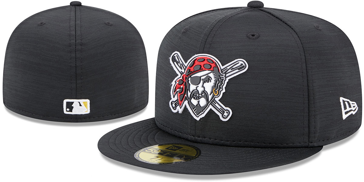Authentic and ORIGINAL 59FIFTY fitted hat by New Era, heathered black performance poly/spandex crown and visor, light grey undervisor, raised embroidered and rubberized 2023 Clubhouse logo on front in team colors, embroidered New Era flag on side, raised embroidered MLB logo on back in white with team color fill. This Pittsburgh Pirates baseball cap is made by New Era and is licensed by the MLB - Major League Baseball.