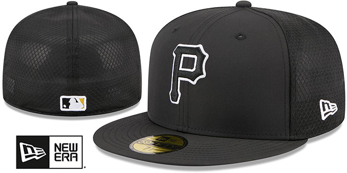 MLB Authentic Collection and ORIGINAL 59FIFTY fitted nylon poly hat by New Era, black nylon crown and visor with black batting practice lightweight performance mesh middle and back panels, black undervisor, raised embroidered team logo on front, embroidered New Era logo on side, raised embroidered MLB logo on back in team colors, This is the style of Onfield Batting Practice hat worn by MLB teams during the 2026 MLB season. This Pittsburgh Pirates baseball cap is made by New Era and is licensed by the MLB - Major League Baseball.