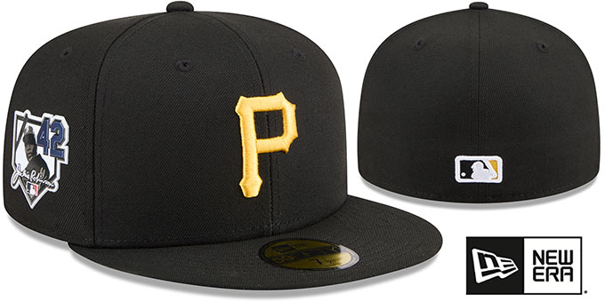 MLB Authentic Collection and ORIGINAL 59FIFTY fitted hat by New Era, black authentic poly crown and visor, kelly green undervisor with 42 in black, Jackie Robinson picture and stats on the inside front panels, raised embroidered Cooperstown team logo on front, embroidered New Era logo on side, rubberized Jackie Robinson homeplate patch on opposite side, raised embroidered MLB logo on back in team colors, This is the style of Onfield hat worn by all MLB teams during the 2026 MLB Jackie Robinson Day. This Pittsburgh Pirates baseball cap is made by New Era and is licensed by the MLB - Major League Baseball.