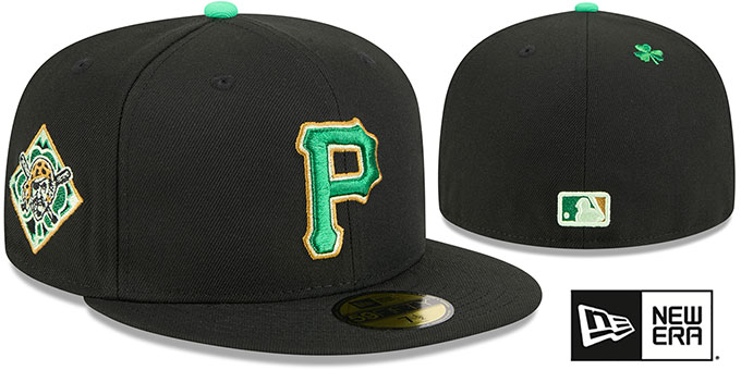 Authentic and ORIGINAL 59FIFTY fitted hat by New Era, black authentic poly crown and visor, black undervisor, green and black plaid inside crown on front panels, raised embroidered team logo on front in kelly green, gold and off white, matching embroidered diamond side patch with team logo and shamrock print, matching embroidered New Era logo on opposite side, kelly green embroidered shamrock on backside top of crown, matching raised embroidered MLB logo on back, This is the style of On-field hat worn by all MLB teams in the 2026 ST PATRICKS DAY games. This Pittsburgh Pirates baseball cap is made by New Era and is licensed by the MLB - Major League Baseball.