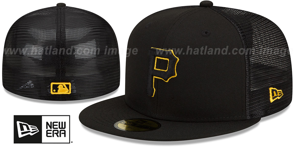 This authentic, officially licensed 59FIFTY fitted cap by New Era features a black poly front panel and visor, black mesh middle and back panels, and a light grey undervisor. The front panel displays a raised, embroidered team logo in black and gold, while the side bears a matching New Era logo. The back showcases a raised, embroidered MLB logo in the team's colors. This is the official hat worn during MLB batting practice throughout the 2022-2023 seasons. This Pittsburgh Pirates baseball cap is made by New Era and is licensed by the MLB - Major League Baseball.
