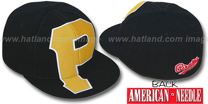 structured fitted hat with deep crown and flat brim, black wool crown and and visor, oversized and larger 'GETTIN' embroidered team logo on front of crown and visor, raised alternate team logo on rear of hat.. This Pittsburgh Pirates hat is made by American Needle and is licensed by the MLB - Major League Baseball.