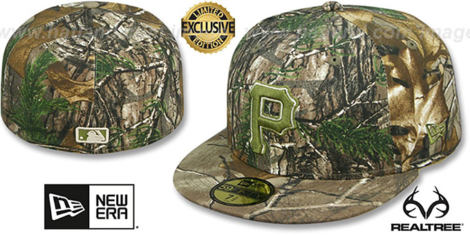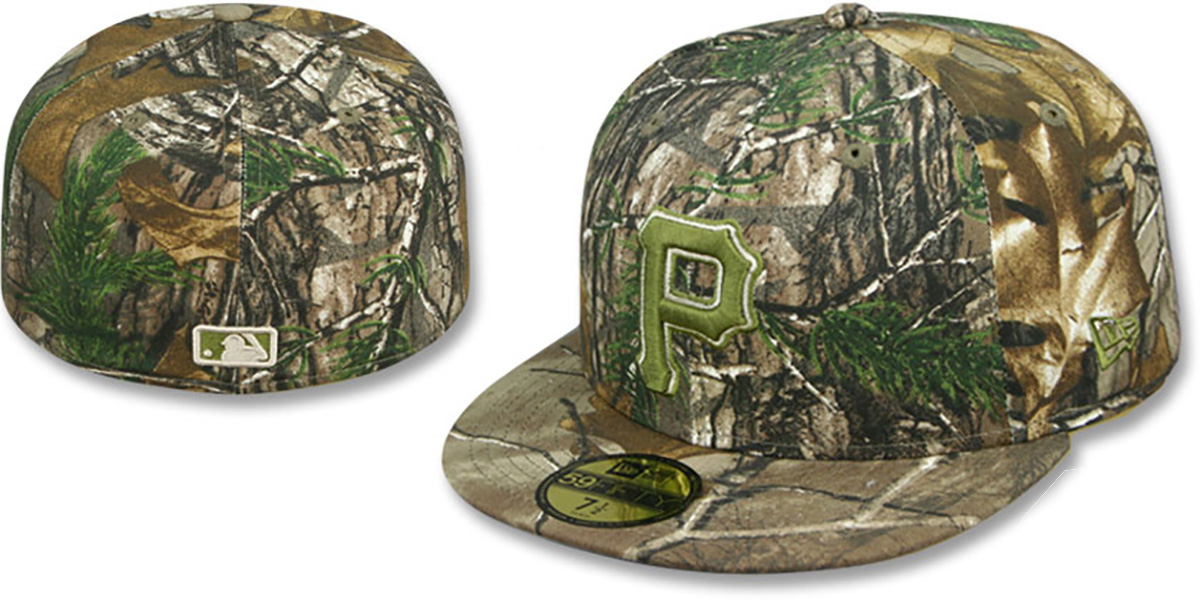 Authentic and ORIGINAL 59FIFTY fitted hat by New Era, Realtree Camouflage (tans, browns, and greens) cotton deep crown and visor with light grey undervisor, raised embroidered team logo on front in olive green and beige, embroidered New Era flag on side, matching raised embroidered MLB logo on back, EACH CAMO HAT PATTERN WILL BE SLIGHTLY DIFFERENT SO NO TWO HATS WILL BE THE SAME. This Pittsburgh Pirates baseball cap is made by New Era and is licensed by the MLB - Major League Baseball.