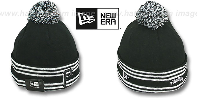 Black 100% acrylic ribbed knit crown, soft light grey poly/wool flannel liner, embroidered team logo on ribbed black and white striped cuff that can be rolled down to cover ears, matching two color pom-pom on top, embroidered alternate team logo on back. This item is on SALE!. This Pittsburgh Pirates hat is made by New Era and is licensed by the MLB Major League Baseball.