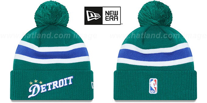 100% acrylic dark spruce green with white and royal blue stripes on knit beanie crown, raised embroidered City Edition logo on front of dark spruce green ribbed cuff, embroidered New Era logo on side, raised embroidered NBA logo on back, matching pom-pom on top, Produced to match NBA City Edition Jerseys and hats worn throughout select 2022-2023 games. This Detroit Pistons hat is made by New Era and is licensed by the NBA - National Basketball Association.
