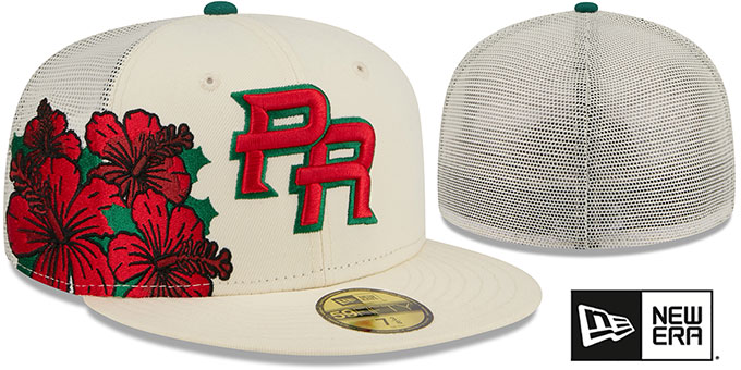 Authentic and ORIGINAL 59FIFTY fitted hat by New Era, chrome (cream) authentic poly front panels with chrome trucker middle and back panels and chrome visor, light grey undervisor, black headband inside cap, matching raised embroidered World Baseball Classic team logo with red and dark green flowers embroidered around side front, matching embroidered New Era logo on opposite side, no logo on back. This Puerto Rico baseball cap is made by New Era and is licensed by the WBC - World Baseball Classic.