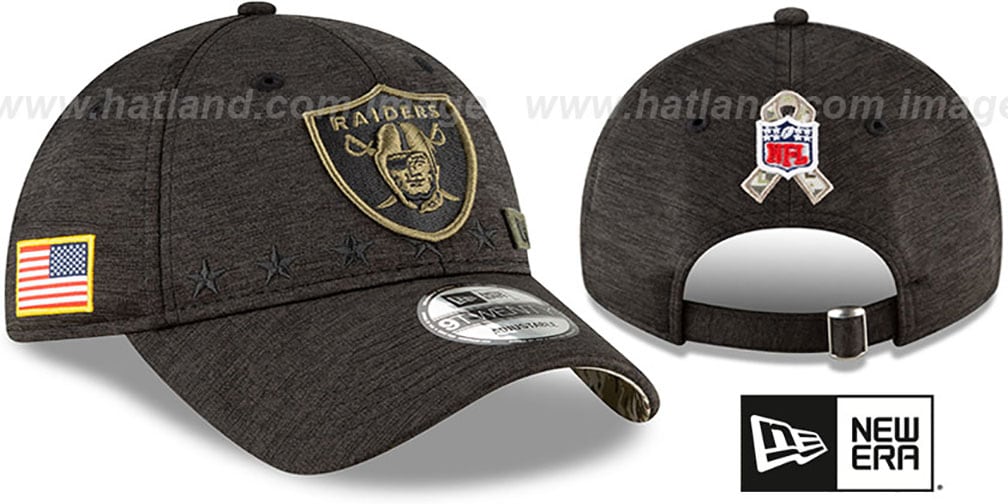 Authentic poly 9TWENTY hat by New Era, black shadow tech (heathered black) crown and pre-curved visor with DIGITAL desert storm camouflage camo undervisor and black headband, raised embroidered team logo on front in military moss green and black over matching team initial patch, embroidered New Era logo on side, embroidered matching USA Flag applique on opposite side, matching embroidered NFL shield logo on back with digital camo military ribbon above matching strap with brass slide loop closure This is the adjustable curved brim style of hat worn by all NFL teams played on Salute to Service 2020 weeks. These commemorative caps honor our Armed Forces through patriotic themes that remind us all of the dedication of our troops. All proceeds from the NFL’s Salute to Service campaign are donated to the NFL’s three military appreciation nonprofit partners: USO, Pat Tillman Foundation, and Wounded Warrior Project. This Las Vegas Raiders hat is made by New Era and is licensed by the NFL National Football League.
