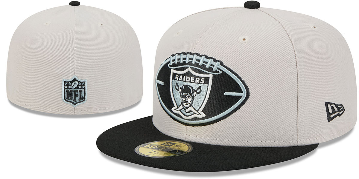 This New Era 59Fifty poly fitted hat features an authentic, original design. The light tan crown contrasts with the black visor and undervisor. The front showcases a raised, embroidered historic team logo, along with a throwback team logo and color fill. An embroidered New Era flag adorns the side, while a raised, embroidered NFL shield logo appears on the back. This Oakland Raiders hat is made by New Era and is licensed by the NFL - National Football League.
