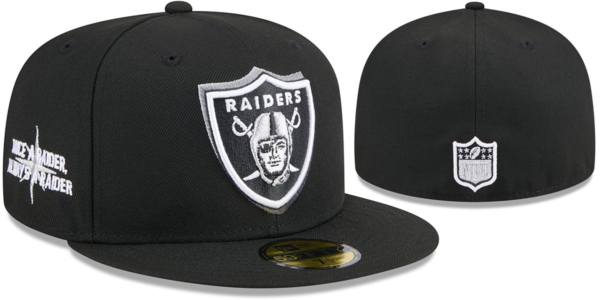 Authentic and ORIGINAL 59FIFTY fitted hat by New Era, black authentic poly deep crown and visor, light grey undervisor, raised embroidered gray-tone logo on front with silver shadow effect, 'ONCE A RAIDER ALWAYS A RAIDER' side-patch. embroidered NFL shield logo on back. embroidered New Era logo on opposite side, The 59FIFTY hat worn during the 2024 NFL Draft. This Las Vegas Raiders baseball cap is made by New Era and is licensed by the NFL National Football League.