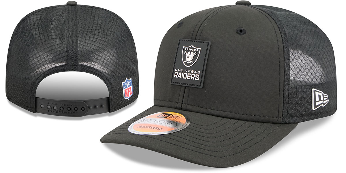 This Authentic New Era Low Profile 9SEVENTY Snapback is the official 2025 NFL Sideline cap worn by players, coaches, and staff. Designed with a structured black water-repellent Quill Tech crown, curved visor, and breathable mesh back panels. Features a quick-dry cushioned sweatband for comfort, silicone team logo patch on the front, jersey stripe applique under the brim, silicone New Era flag on the side, NFL Shield on the back, and an adjustable snapback closure.. This Las Vegas Raiders hat is made by New Era and is licensed by the NFL - National Football League.