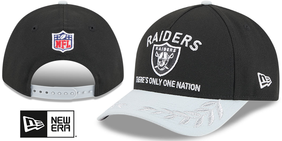 Original fit 9FIFTY M-Crown snapback hat by New Era that has deep 5-panel crown and slightly curved brim, black authentic poly crown with rounded low-profile front panels and light grey visor with tonal embroidered leaf pattern, light grey undervisor, embroidered team name with raised embroidered team logo on front, embroidered New Era logo on side, embroidered NFL shield logo on back above above team color snapback closure, The 9FORTY M-CROWN SNAPBACK hat worn during the 2025 NFL Draft. This Las Vegas Raiders hat is made by New Era and is licensed by the NFL - National Football League.