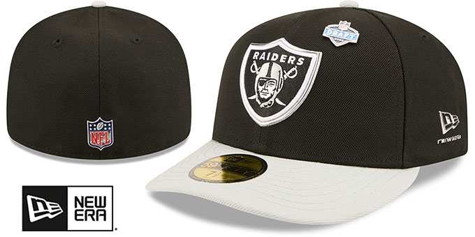 Authentic and ORIGINAL 59FIFTY fitted performance poly hat by New Era, black rounded crown with grey slightly precurved visor and 2026 NFL Draft pin on crown, light grey undervisor, red-white-blue stars and stripes print on inside front panels, embroidered team logo on front with liquid chrome outline, liquid chrome New Era logo on side, liquid chrome NFL shield logo on back, This is the Low Crown fitted style of hat worn by all NFL players during the 2026 NFL Draft. This Las Vegas Raiders baseball cap is made by New Era and is licensed by the NFL - National Football League.