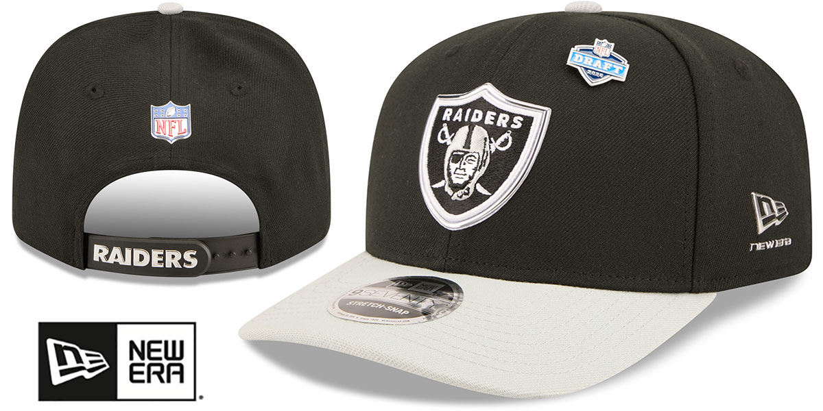 This New Era Low Profile 9SEVENTY STRETCH SNAP hat features a black rounded crown with grey slightly precurved visor and 2026 NFL Draft pin on crown, light grey undervisor, team inspired print on inside front panels, embroidered team logo on front with liquid chrome outline, liquid chrome New Era logo on side, liquid chrome NFL shield logo on back above team color snap with team name in liquid chrome, This is the 9SEVENTY stretch snapback style of hat worn by all NFL players during the 2026 NFL Draft. This Las Vegas Raiders hat is made by New Era and is licensed by the NFL - National Football League.