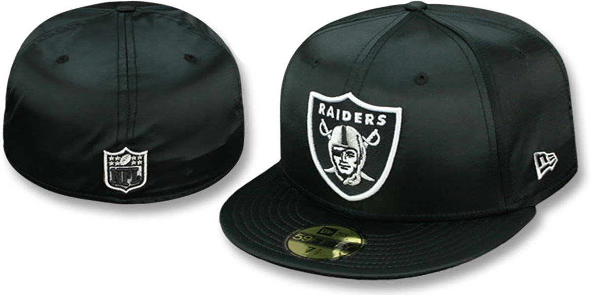 Authentic and ORIGINAL 59FIFTY poly satin fitted hat by New Era, black deep crown and visor, raised embroidered team logo on front in team colors, matching embroidered New Era flag logo on side, matching raised embroidered NFL logo on back. This Las Vegas Raiders baseball cap is made by New Era and is licensed by the NFL - National Football League.
