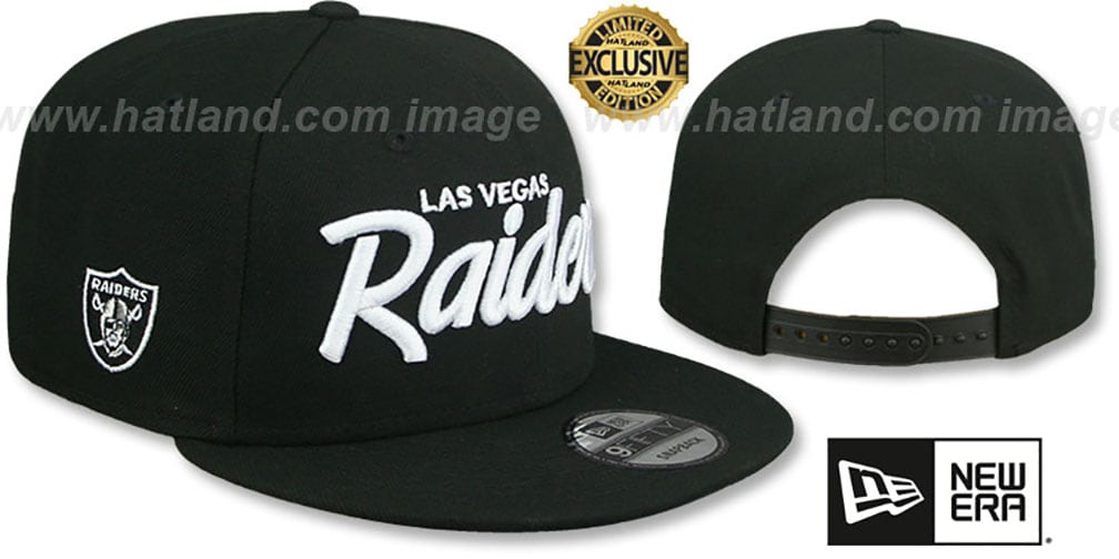 Original fit 9FIFTY adjustable authentic poly hat by New Era that has similar deep crown and flat brim fit as the 59-Fifty, black crown and visor, light grey undervisor, raised embroidered Las Vegas Raiders SCRIPT team name on front in white, matching embroidered New Era flag on side, embroidered team logo on opposite side, matching adjustable Snapback strap closure . This Las Vegas Raiders hat is made by New Era and is licensed by the NFL - National Football League.