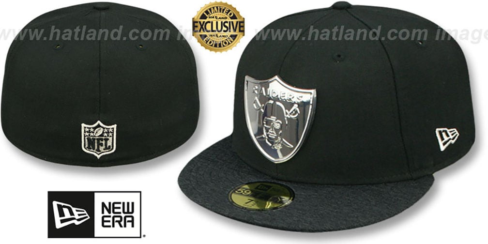 Authentic and ORIGINAL 59Fifty wool fitted hat by New Era, black deep crown and shadow tech black heather grey poly visor, light grey undervisor, silver chrome metal team logo attached to front, matching embroidered New Era logo on side, matching metallic silver and black raised embroidered NFL logo on back . This Oakland Raiders hat is made by New Era and is licensed by the NFL - National Football League.