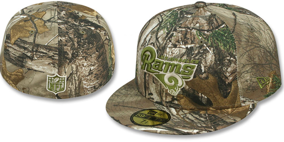 Authentic and ORIGINAL 59FIFTY fitted hat by New Era, Realtree Camouflage (tans, browns, and greens) cotton deep crown and visor with light grey undervisor, raised embroidered team logo on front in olive green and beige with LOS ANGELES above logo, embroidered New Era flag on side, matching raised embroidered NFL shield logo on back, EACH CAMO HAT PATTERN WILL BE SLIGHTLY DIFFERENT SO NO TWO HATS WILL BE THE SAME. This Los Angeles Rams baseball cap is made by New Era and is licensed by the NFL - National Football League.