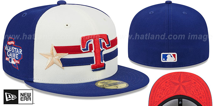 Authentic 59FIFTY fitted cap by New Era, featuring a royal blue crown and visor, cream front panels, and a red paisley undervisor. Stitched horizontal stripes in red and royal with a raised embroidered star and team logo on the front. Embroidered New Era logo on the side, 2024 All-Star Game logo on the opposite side, and a matching raised MLB logo on the back. This is the official cap worn during the 2024 All-Star Game workouts and Home Run Derby in Texas. This Texas Rangers baseball cap is made by New Era and is licensed by the MLB - Major League Baseball.