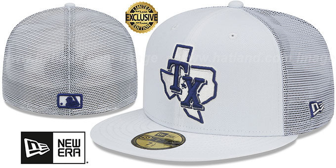 This authentic, original 59FIFTY fitted cap by New Era boasts a striking design. The front panels and visor are made of crisp white poly, while the middle and back panels feature a soft white trucker mesh. Accenting the light grey undervisor is a raised, embroidered team logo in light navy blue and white on the front. The side bears a matching embroidered New Era logo, and the back showcases a raised, embroidered white MLB logo with a light navy fill. This Texas Rangers baseball cap is made by New Era and is licensed by the MLB - Major League Baseball.