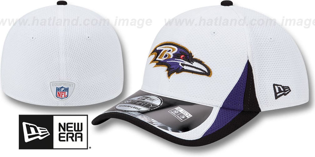 New Era 39THIRTY stretch fit hat with white poly pique crown and visor, team color undervisor and top edge of visor, raised embroidered team logo on front, embroidered striping on side front panels and visor in team colors, NFL EQUIPMENT logo embroidered on back of Flex hatThis Flex 39THIRTY hat fits approximate head sizes (Sm / Med 6 7/8 - 7 1/4) (Med / Lg 7 1/4 - 7 5/8) (Lg / Xlg 7 5/8 - 8 ). This Baltimore Ravens hat is made by New Era and is licensed by the NFL - National Football League.