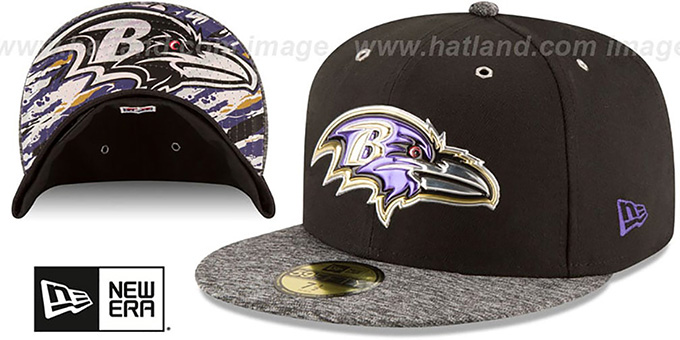 Authentic and ORIGINAL 59Fifty fitted hat by New Era, black authentic poly deep crown with dark heather grey visor, silver foil undervisor team logo and team color print, Liquid Chrome foil team logo on front, embroidered New Era logo on side, raised embroidered NFL shield logo on back, This is the 59FIFTY hat worn during the 2016 NFL Draft. This Baltimore Ravens baseball cap is made by New Era and is licensed by the NFL National Football League.