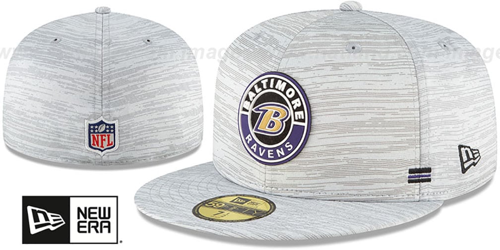 Authentic and ORIGINAL 59Fifty fitted hat by New Era, heathered light grey performance poly/spandex crown and visor, team color undervisor, raised rubberized 2020 sideline circle team logo on front in team colors, embroidered 3 team color stripes on side front seams, embroidered New Era flag on side, embroidered NFL shield logo on back. This Baltimore Ravens hat is made by New Era and is licensed by the NFL - National Football League.