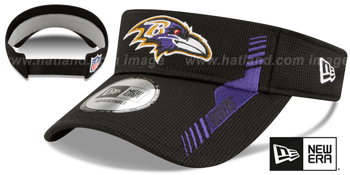 Authentic adjustable visor by New Era that has a low rise and curved brim, black dashmark mesh rise and visor with team color embroidery extending from the rise to the visor with team name, black undervisor, raised embroidered team logo on front, embroidered New Era flag on side, embroidered NFL shield logo patch on back to the side of the team color Velcro strap closure, the official visor that players, coaches and staff will wear on the sidelines during the 2021 NFL season. This Baltimore Ravens hat is made by New Era and is licensed by the NFL - National Football League.