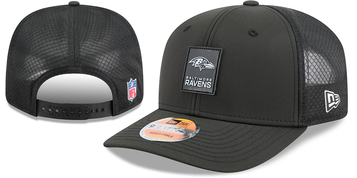 This Authentic New Era Low Profile 9SEVENTY Snapback is the official 2025 NFL Sideline cap worn by players, coaches, and staff. Designed with a structured black water-repellent Quill Tech crown, curved visor, and breathable mesh back panels. Features a quick-dry cushioned sweatband for comfort, silicone team logo patch on the front, jersey stripe applique under the brim, silicone New Era flag on the side, NFL Shield on the back, and an adjustable snapback closure.. This Baltimore RAVENS hat is made by New Era and is licensed by the NFL - National Football League.