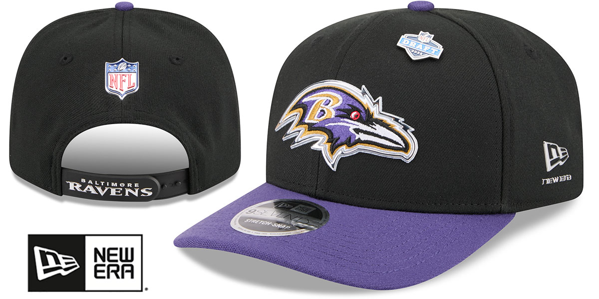 This New Era Low Profile 9SEVENTY STRETCH SNAP hat features a black rounded crown with purple slightly precurved visor and 2026 NFL Draft pin on crown, light grey undervisor, team print on inside front panels, embroidered team logo on front with liquid chrome outline, liquid chrome New Era logo on side, liquid chrome NFL shield logo on back above team color snap with team name in liquid chrome, This is the 9SEVENTY stretch snapback style of hat worn by all NFL players during the 2026 NFL Draft. This Baltimore Ravens hat is made by New Era and is licensed by the NFL - National Football League.