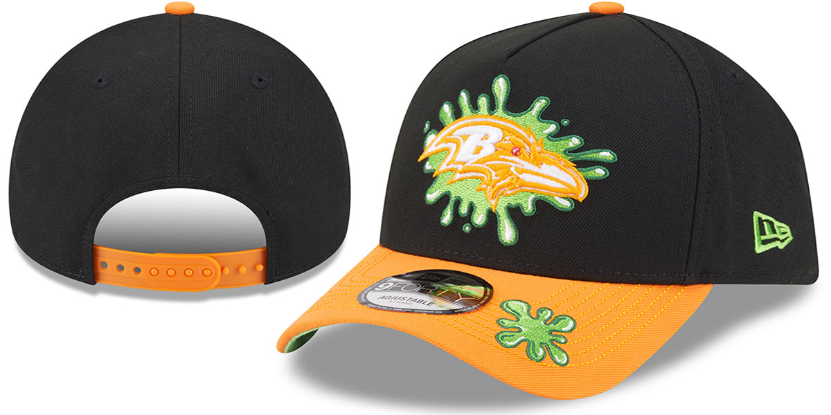 This New Era 9FORTY A-Frame Snapback has a black five-panel crown with pinched front seam, precurved orange visor, and lime green undervisor. Features the embroidered SLIME team logo in lime green, orange, white, and red on the front, matching New Era logo on the side, and an orange snapback closure.. This Baltimore Ravens hat is made by New Era and is licensed by the NFL - National Football League.