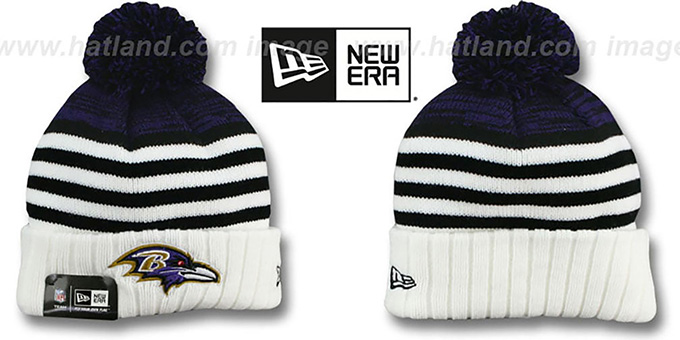 100% acrylic ribbed knit black and white striped crown with white cuff, embroidered team logo on front, team color pom-pom on top, small New Era Flag embroidery on side. This Baltimore Ravens hat is made by New Era and is licensed by the NFL National Football League.