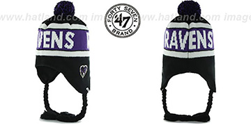 black acrylic knit beanie with ribbed cuff, raised embroidered team logo on front of cuff, two embroidered official Super Bowl logos on crown from the years winning the NFL Championship, embroidered New Era Flag on side, matching emboidered team font and logo on back, matching opposite team color pom-pom. This item is on SALE!. This Baltimore Ravens hat is made by New Era and is licensed by the NFL National Football League.