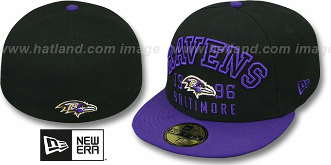 Authentic and ORIGINAL 59Fifty fitted hat by New Era, black authentic poly deep crown with the high tech fabric that has revolutionary wicking ability, superior drying, and is shrink resistant, purple visor and throwback green undervisor, raised embroidered team name on front with small team logo and established date, embroidered team logo font on back. This item is on SALE!. This Baltimore Ravens hat is made by New Era and is licensed by the NFL National Football League.